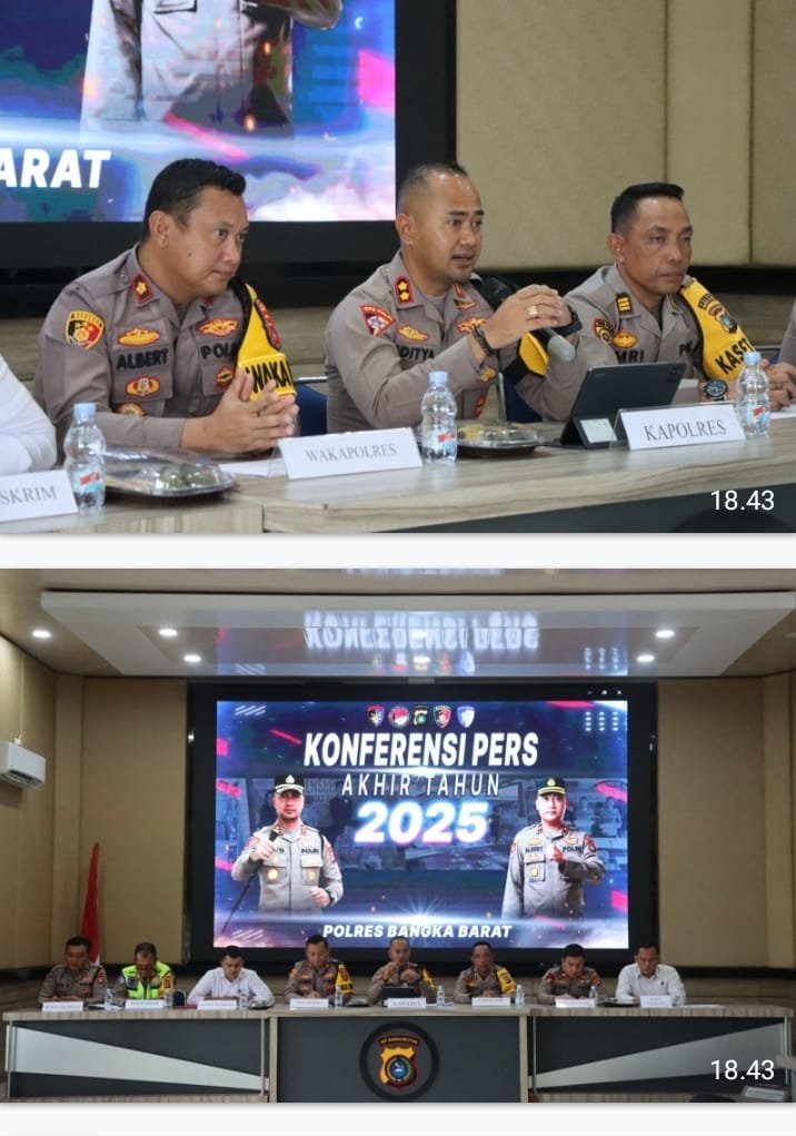 JEJAKBERITA.86.COM. Konferensi pers akhir tahun 2025 Polres Bangka Barat dipimpin langsung oleh Kapolres Bangka Barat AKBP Pradana Aditya Nugraha didampingi Wakakapolres Bangka Barat Kompol Albert D. H. Tampubolon, serta pejabat utama Polres Bangka Barat.