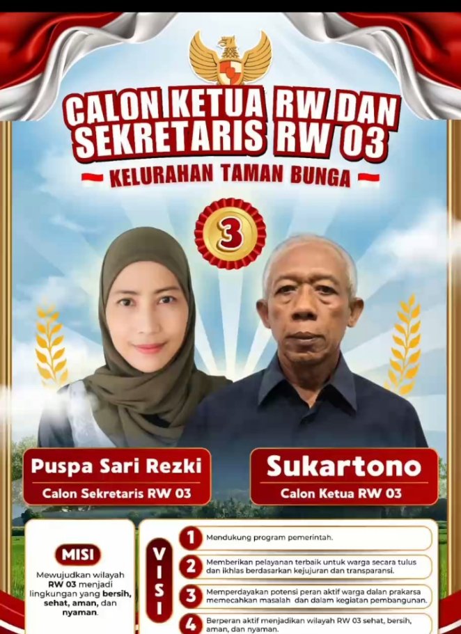 Disamping  itu juga atas nama kami selaku calon Mohon Doa dan dukungannya , mari kita sukses pemilihan Rt.dan Rw sekota pangkalpinang  pada tanggal 18 -0-2026 pada hari Sabtu  ini. Dan jangan lupa pilihan anda No 03 . Calon Rw.03 Sukartono Dan sekertaris RW.03 Puspa Sari Rezki