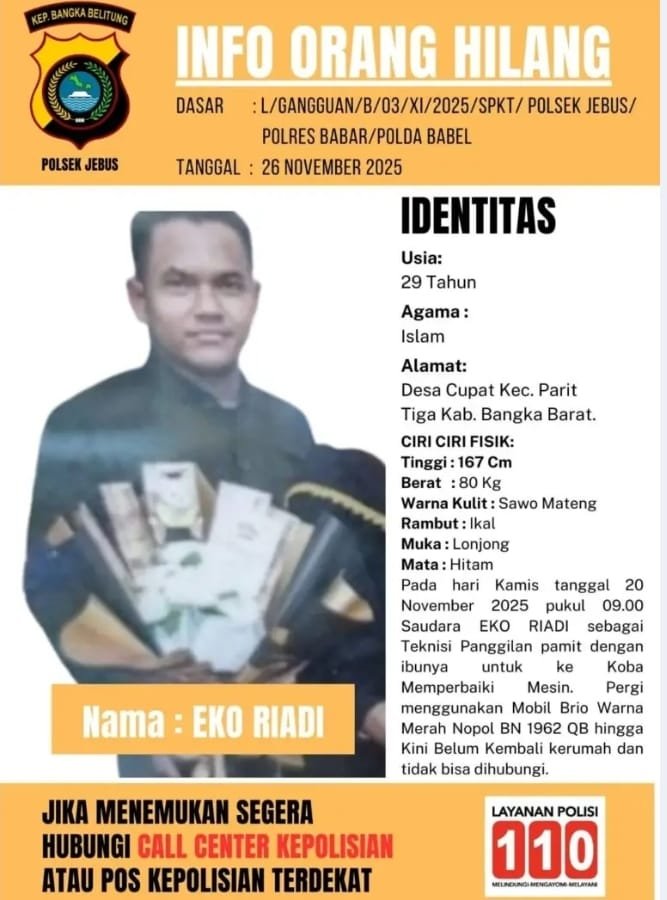 BANGKA — Polres Bangka Barat (Babar) melalui Polsek Jebus bergerak cepat menindaklanjuti laporan hilangnya Eko Riadi, warga Desa Cupat Kecamatan Jebus tidak pulang sejak Kamis (20/11/2025).