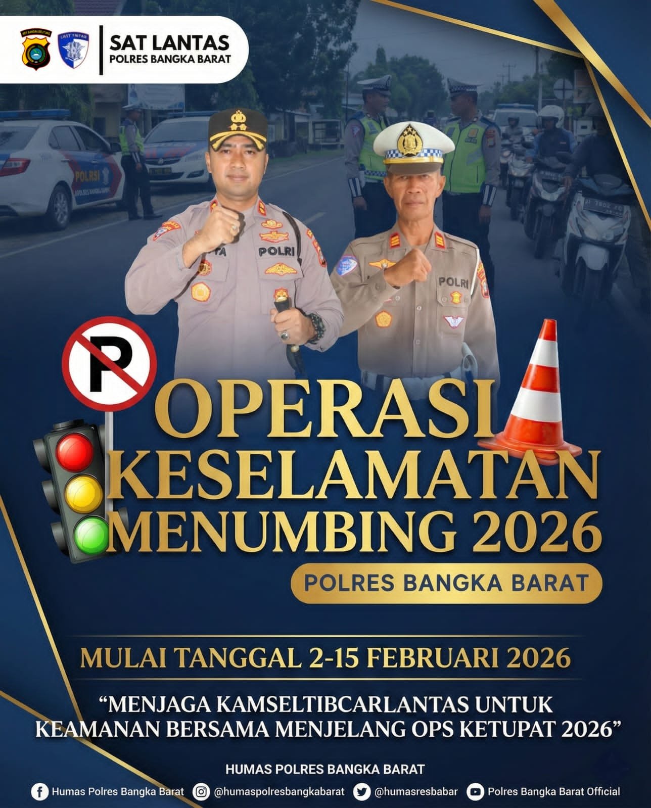 Polres Bangka Barat, Polda Kepulauan Bangka Belitung, menggelar Operasi Keselamatan Menumbing 2026 sebagai upaya meningkatkan kesadaran dan kepatuhan masyarakat dalam berlalu lintas sekaligus menciptakan keamanan, keselamatan, ketertiban, dan kelancaran lalu lintas (Kamseltibcarlantas).
