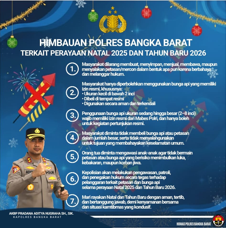 Kepolisian Resor (Polres) Bangka Barat mengimbau masyarakat untuk tidak menggunakan petasan maupun kembang api secara sembarangan menjelang perayaan Natal 2025 dan Tahun Baru 2026, guna menjaga keamanan dan ketertiban masyarakat (kamtibmas).Rabu 24 Desember 2025