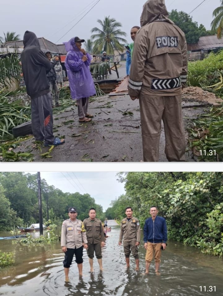 Personel Polsek Jebus Polres Bangka Barat bersama Bhabinkamtibmas, perangkat desa, TNI, dan relawan masyarakat melakukan pengecekan dan penanganan di sejumlah titik kritis: