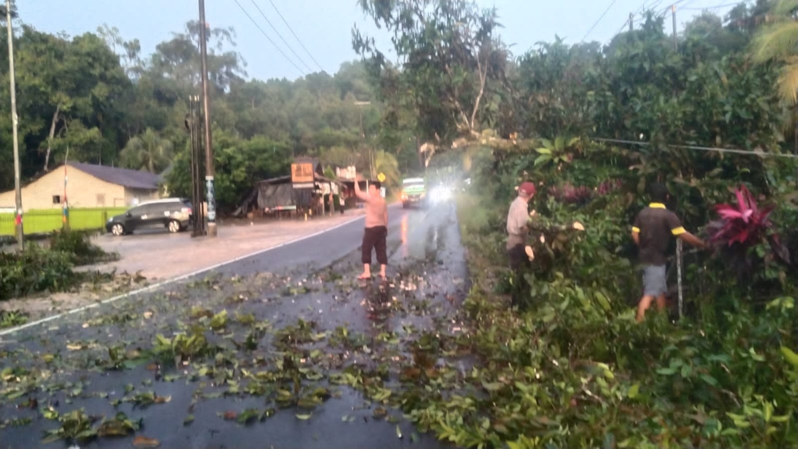 Rabu (10/12/2025) pagi, Polsek Simpang Teritip bersama warga Desa Pelangas membersihkan pohon tumbang yang menutupi jalan raya di depan Masjid Miftahul Jannah, Desa Pelangas. Jalan ini merupakan akses utama penghubung Pangkal Pinang – Mentok, sehingga kelancaran arus lalu lintas sangat penting bagi mobilitas warga.
