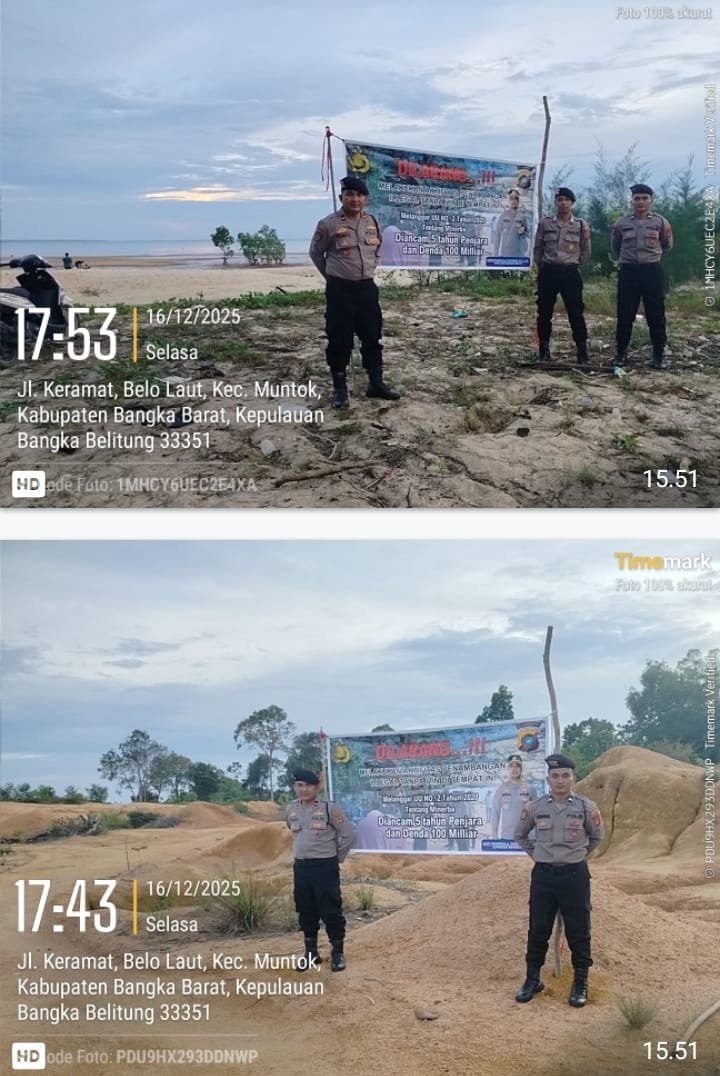 JEJALBERITA.86.COM. BANGKA BARAT Dalam upaya mencegah kerusakan lingkungan serta menekan aktivitas penambangan ilegal, Satgas Preventif Polres Bangka Barat melaksanakan pemasangan spanduk imbauan dan larangan di sejumlah titik rawan tambang ilegal, Selasa (16/12/2025).