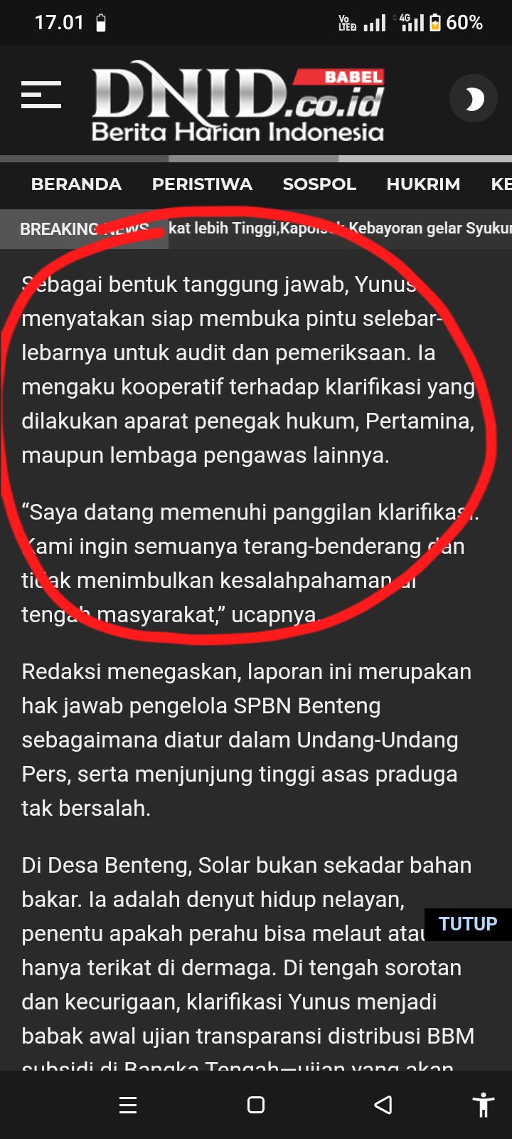 Dalam klarifikasinya, Yunus secara terbuka menyatakan siap diperiksa dan diaudit secara menyeluruh, baik oleh aparat penegak hukum, Pertamina, maupun lembaga pengawas terkait.